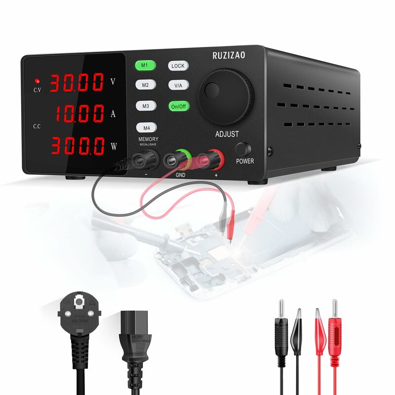 RUZIZAO Zasilacz laboratoryjny 30 V 10 A, 4-cyfrowy wyświetlacz DC, regulowany zasilacz, galwanizacja, ładowanie, konserwacja elektroniczna, kontrola rur, zasilacz laboratoryjny z przyciskiem